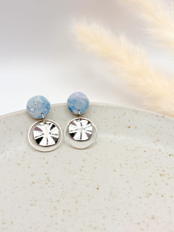 Polymer Clay, Edelstahl (Ohrstecker/Ohrharken/Creolen), Uv-Resin, ggf. Blattgold, Acrylfarbe, Glitzer, Wasserbasierter Lack – Mit Silikonstecker